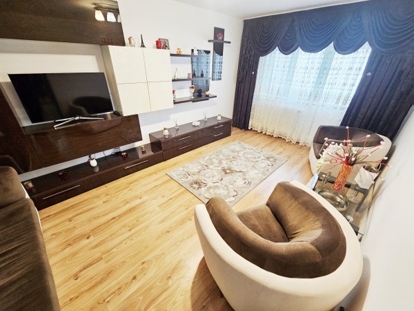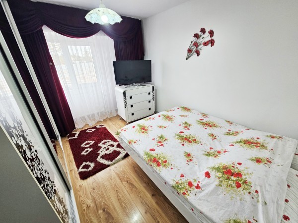 Acest apartament de închiriat are 56 mp și se află la etajul 2 al unui bloc din beton cu 4 nivele. Este compus din 2 camere, o bucătărie separată un hol , un grupur sanitar și un balcon. Apartamentul este mobilat complet și dotat cu mașină de spălat, frigider și televizor.