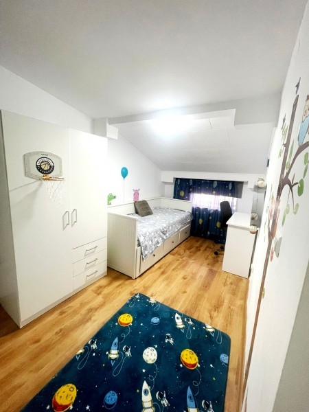 Acest apartament de 75 mp situat la etajul 5 dintr-un imobil cu 5 niveluri, construit în 2008, oferă un spațiu luminos și funcțional. Dispune de mobilier, aparate electrocasnice și echipamente precum mașină de spălat, frigider, plită, cuptor și TV. Tâmplăria din PVC și pardoselile din lemn și laminate contribuie la un ambient plăcut.