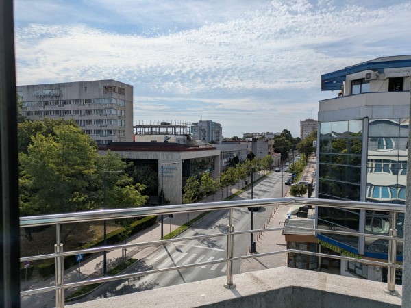 Ultracentral, zona cu restaurante si cafenele. (Str. Mircea cel Batran colt cu aleea de acces la Sala Sporturilor, cu vedere spre parc.)