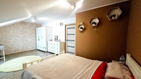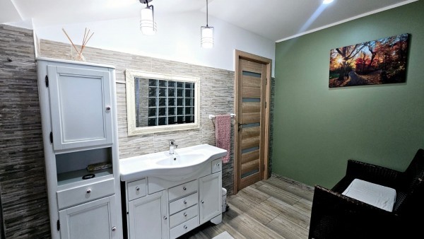 Casa dispune de 3 bai din care o baie este prevazuta cu dus cealalata avand cada. Incalzirea se face prin pardoseala insa casa beneficiaza si de calorifere pentru o incalzire mai rapida in caz de reintoarcere acasa dupa o calatorie. Livingul este si el incalzit suplimentar cu un semineu care functioneaza cu lemne, acesta creaza un ambient de vis caminului si familiei cat si musafirilor. Usile de interior sunt din MDF de o calitate inalta.