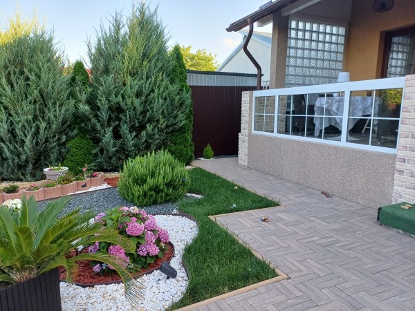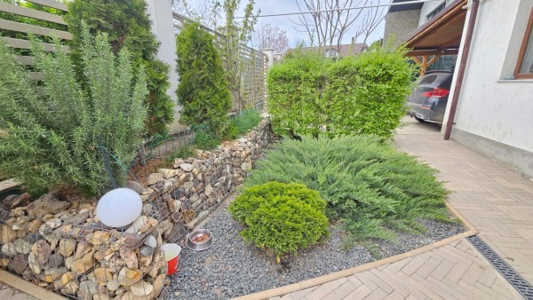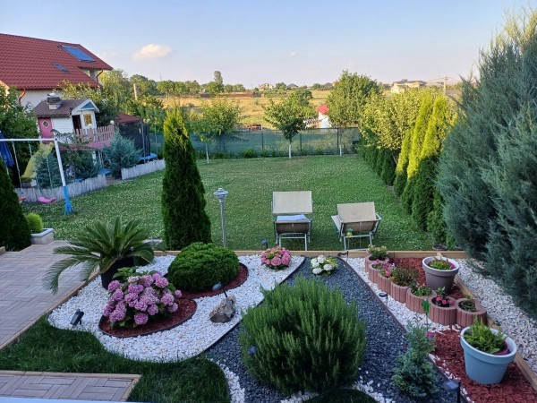 Terasa casei este amenajata modern cu pavaj de jur imprejurul casei. Gradina este amenajata si ea cu gazon si plante ornamentale, avand si spatiu amenajat pentru copii, Gazonul este intretinut si udat prin intermediul a doua suspensoare la fel si brazii Tuia din gradina sunt udati prin sistem de irigat. In lateralul mobilului este o terasa amenajata si acoperita pentru parcarea masinii in curte.