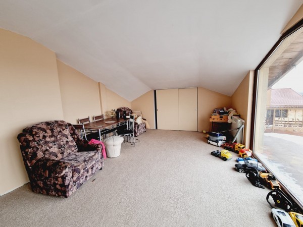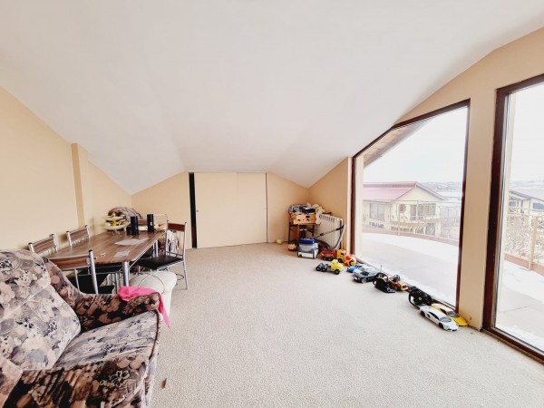 La etaj regasim 3 dormitoare, grup sanitar, 2 terase. Mansarda este formata din camera de zi/loc de joaca pentru copii, terasa spatioasa, dormitor, grup sanitar.